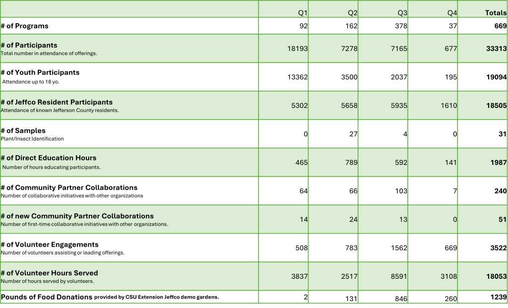 CSU Extension, Jefferson County strives to meet the needs of our community. We prioritize offerings in the areas of Land, Youth and Community, and welcome people of all backgrounds and identities to participate in our offerings.