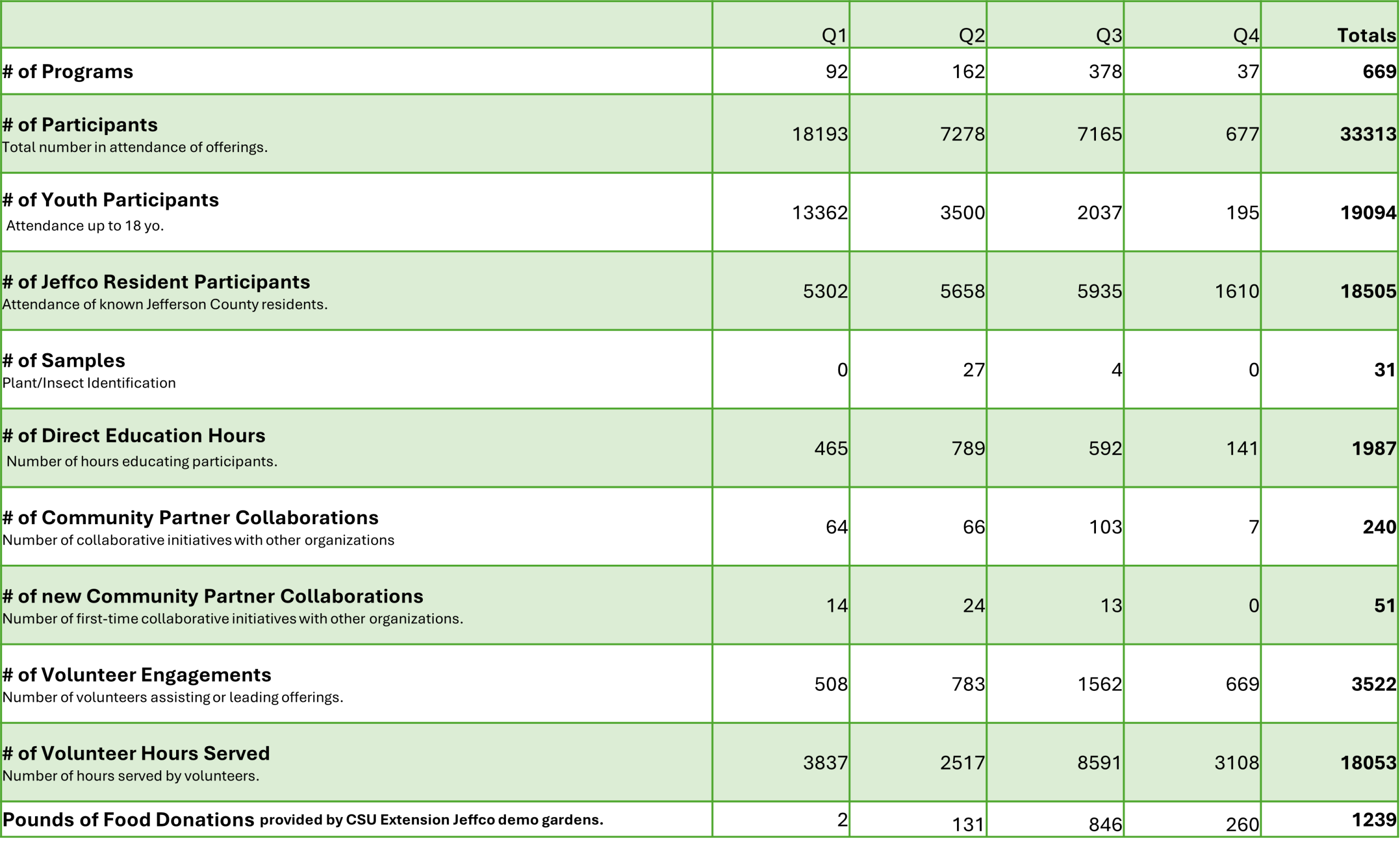 CSU Extension, Jefferson County strives to meet the needs of our community. We prioritize offerings in the areas of Land, Youth and Community, and welcome people of all backgrounds and identities to participate in our offerings.